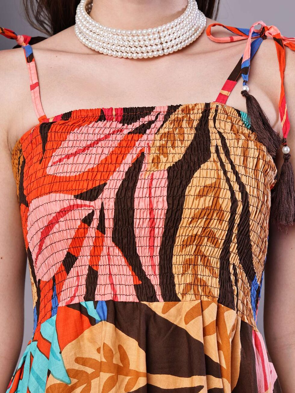 Effortlessly stylish dress with a vibrant abstract print, tie-up shoulder straps, and a chic high-low handkerchief hemline ? perfect for casual days or evening gatherings.
